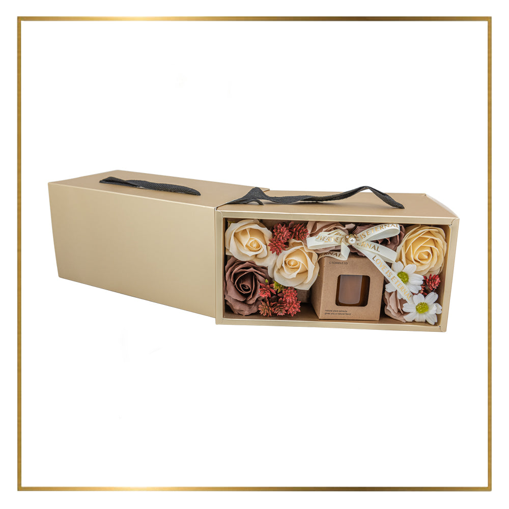✨🌹 Introducing our exquisite "Candle Suitcase" gift, a luxurious and enchanting ensemble that combines the warmth of a scented candle with the timeless beauty of decorative soap roses. Nestled within a charming suitcase box, this gift is designed to delight the senses and create a truly captivating experience.