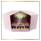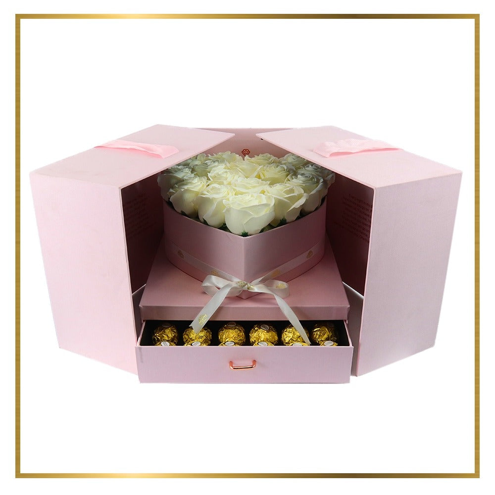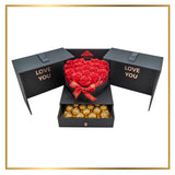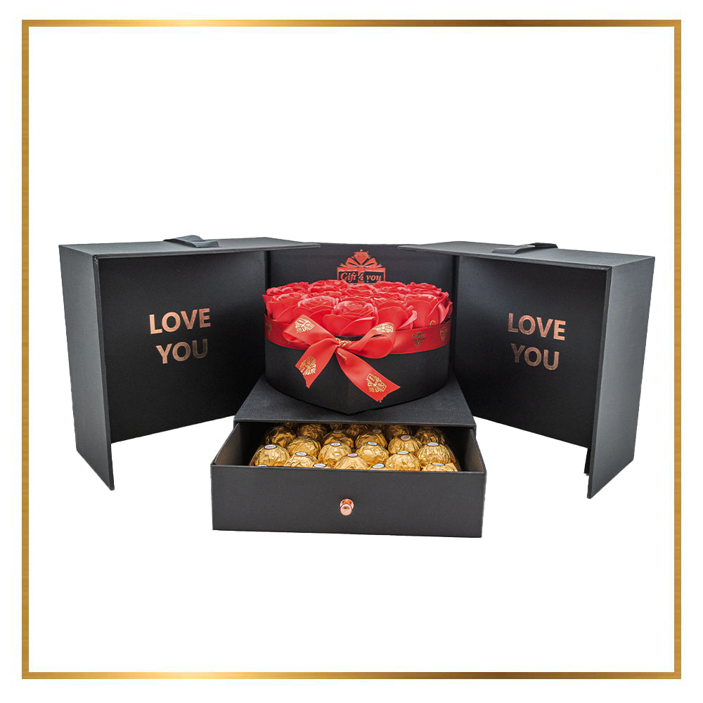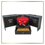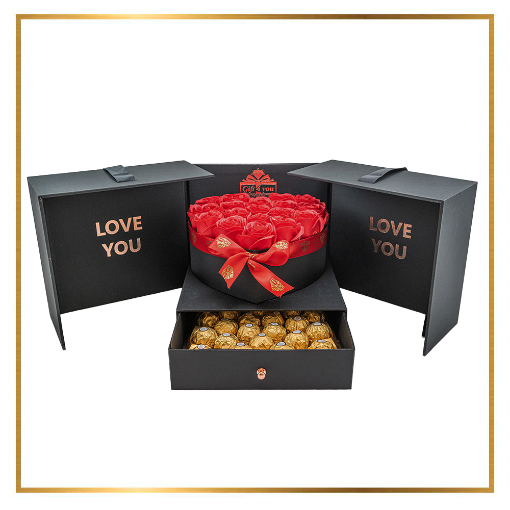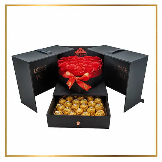 💝💬 But that's not all! As they pull out the hidden drawer, a sweet message of love will reveal itself, adding a personalized touch to this special gift. And nestled within the box, you'll find a small compartment filled with a breathtaking arrangement of Twenty-five premium Ferrero Rocher chocolates, the epitome of indulgence and decadence.