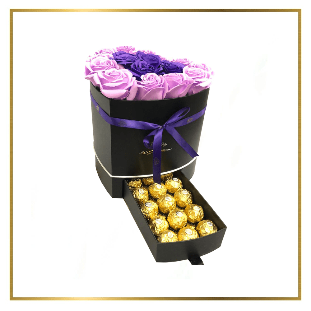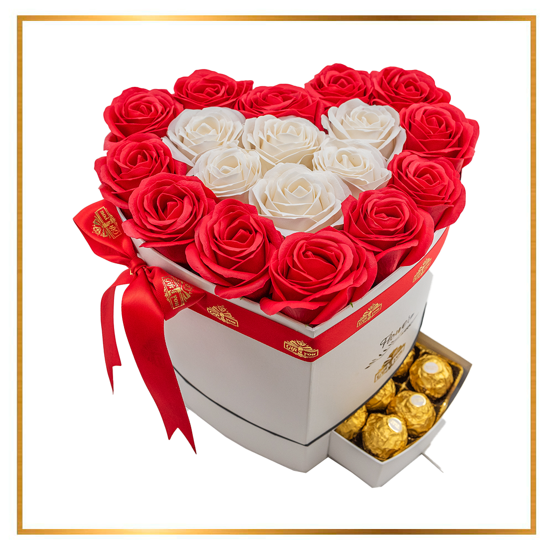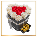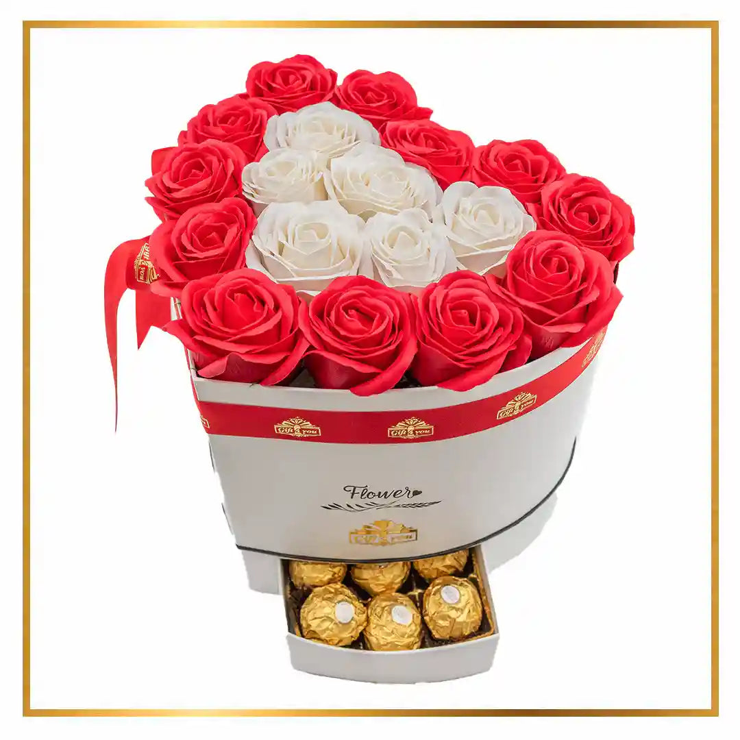 🎁 The centerpiece of the "Mi Amor" gift is a heart-shaped box adorned with two different colored handcrafted, everlasting, decorative soap roses. Each rose is meticulously crafted, embodying the essence of everlasting love and devotion. The combination of colors adds depth and symbolism to the arrangement, representing the unique bond between two hearts entwined in love.