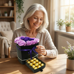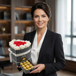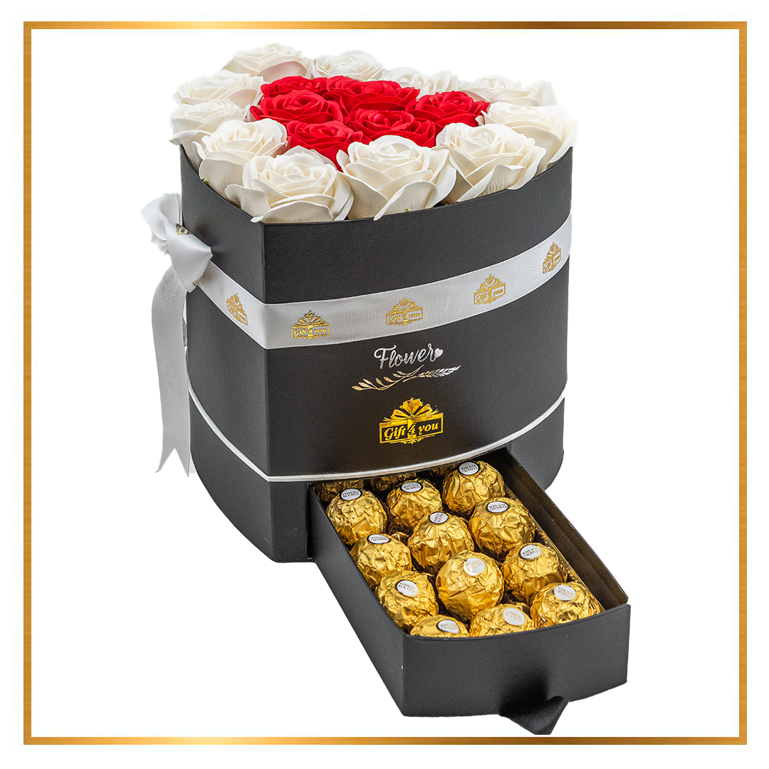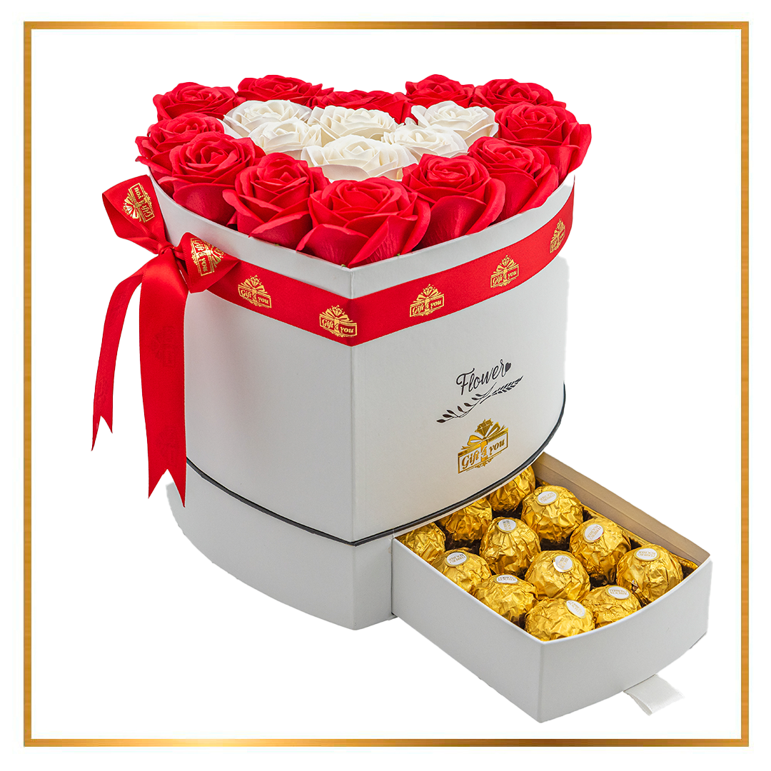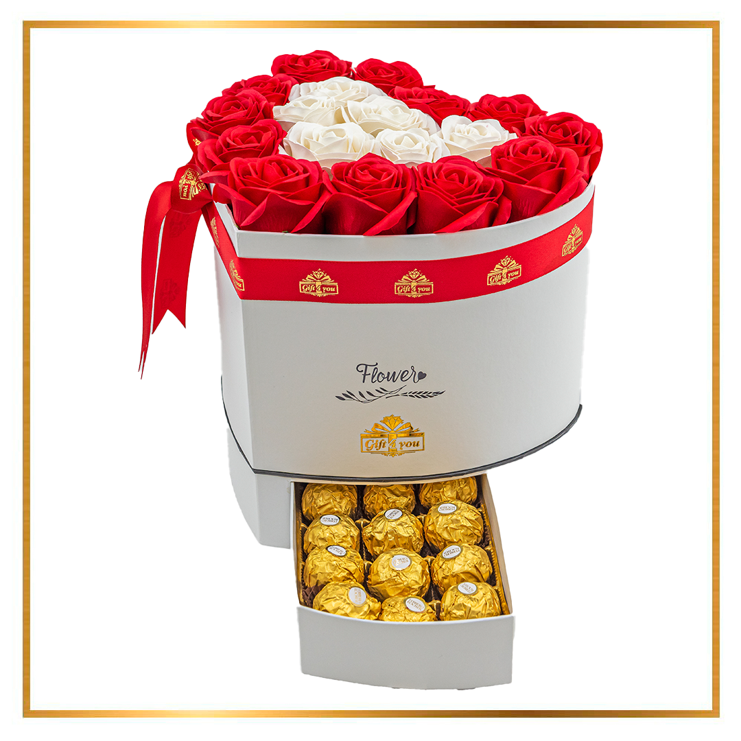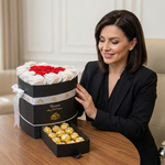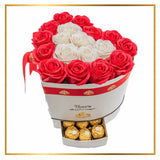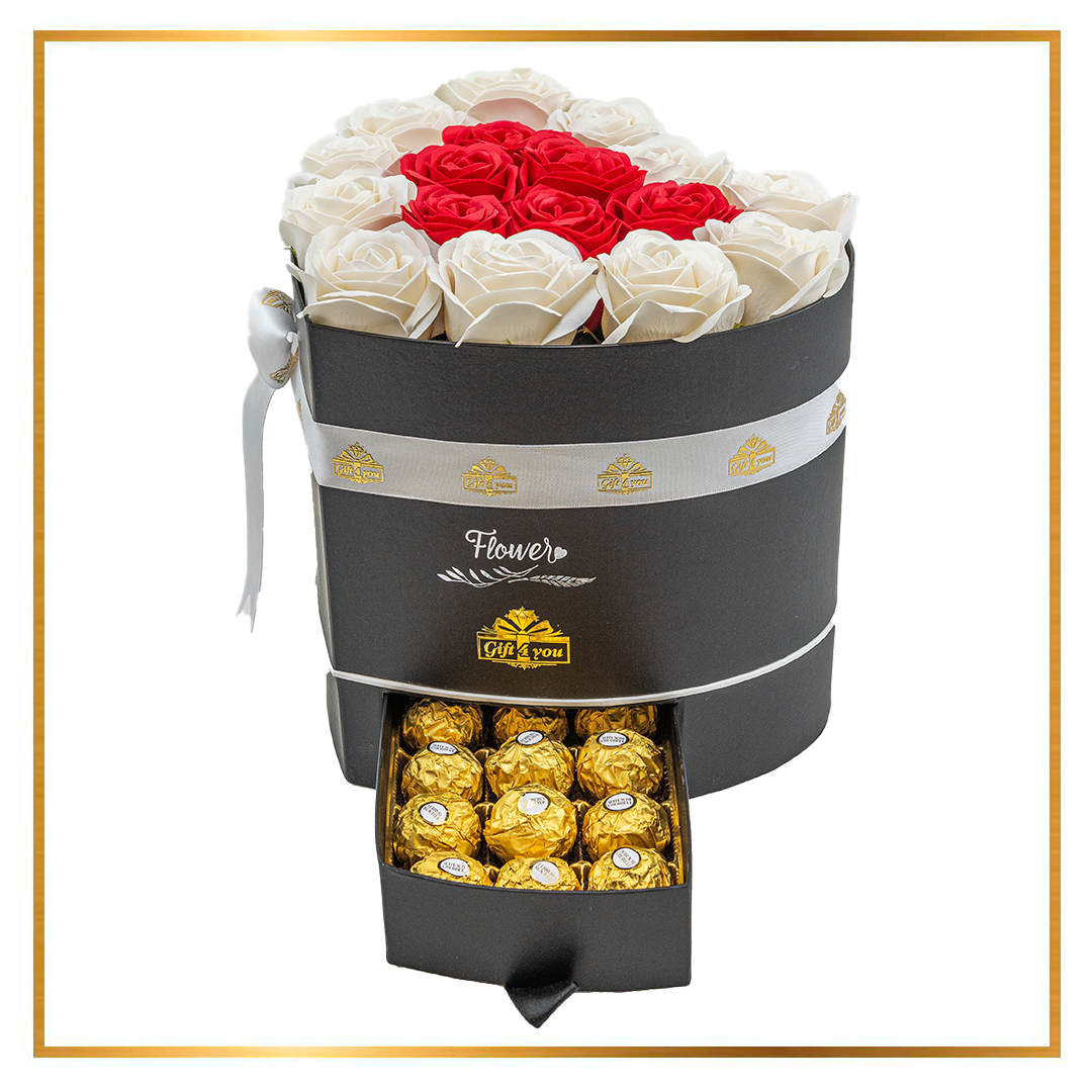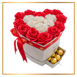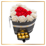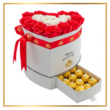 💝 The "Mi Amor" gift is more than just a collection of beautiful elements; it is a meticulously arranged expression of love. The heart-shaped box not only holds the gorgeous roses but also features a dedicated compartment for the Ferrero Rocher chocolates. This thoughtful design adds an extra touch of sweetness to the recipient's experience, making it an unforgettable gesture of affection.