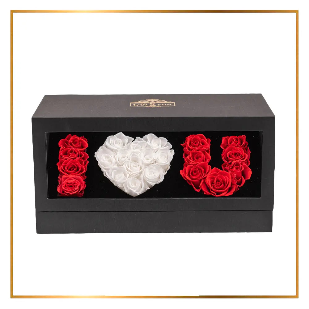 Open the Nova Box to reveal a captivating arrangement of eternal roses, meticulously selected for their beauty and preserved to last a lifetime. The combination of passionate red and pure white roses spell out "I Heart U" in a breathtaking setting that speaks volumes without saying a word.