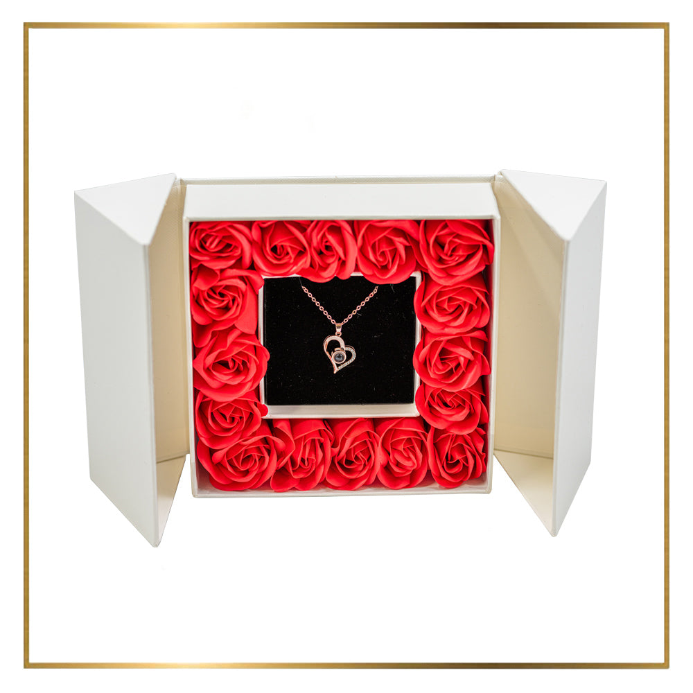 💍✨ The centerpiece of the "Rose and Necklace Box" is the heartfelt addition of an "I love you" necklace in 100 languages. This remarkable necklace serves as a profound expression of love, allowing you to convey your affection in a unique and sentimental way. As your loved one admires the stunning roses, they will be pleasantly surprised to discover the hidden treasure nestled within the arrangement – a necklace that speaks volumes of your devotion.